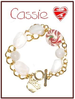 Cassie consists of pretty white beads, a 14K gold comb charm, and a pretty lentil made by Adeline, with a toggle closure. Different pattern chains. Matches any outfit, be it casual or formal. (: