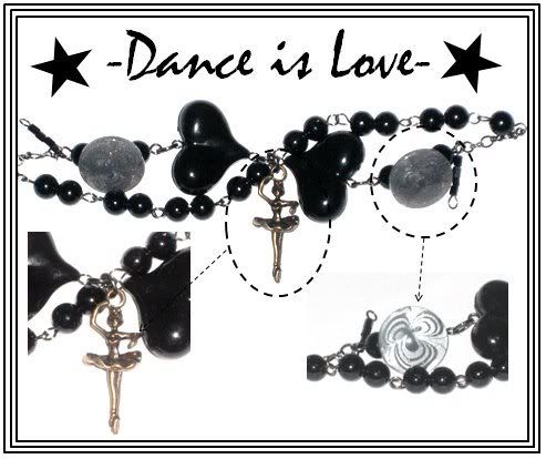 DANCE IS LOVE (SOLD!) I dedicate this piece to all the dancers out there! (: This is a pretty bracelet consisting of a 3D ballerina charm, with black puffed hearts and beads. (: The grey circle things have glitter in them.. Black rhodium findings and patterned chains. one and only piece!
