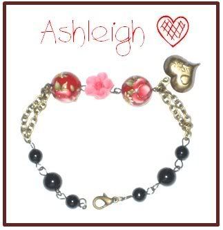 Ashleigh is something similar to Ashley, with more pattern, this time its antique green. (: With an antique puffy heart charm. Japanese tensha beads used. With a pink coloured clay flower, black beads and a lobster hook closure. (: $13.90