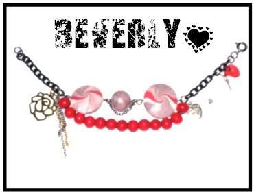 I handmade those clay lentils and rondelles to achieve a strawberry swirls effect. Pinkish ont he go. Metallic base such. I inserted a gold rose charm, and some prism charms and red beads. Lastly, a made with love charm. (: I HOPE SHE LIKES IT! :D