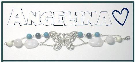 Angelina is a bracelet with w butterfly as a focal point. I added shades of turquoise beads and some white semi-transparent beads and rhodium chains. (: