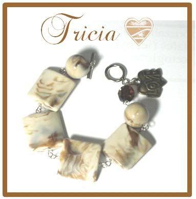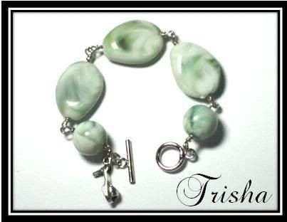 Trisha is something like Tricia. This time its jadey like coloured. Really pretty. Wired them together with a cutesy heel charm and a toggle closure to match with it. Silver rhodium materials. Length of bracelet would be approx. 17.5cm.