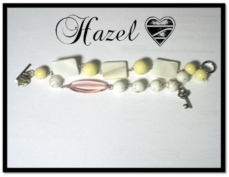 Customized Charm Bracelet for Hazel. (: I'm really glad she loved it! :D Consists of a pink Czech Glass oval bead, a made with love charm, a key charm, white beads with gold linings on it, cream coloured bedas with shells. Ending up with a toggle closure.
