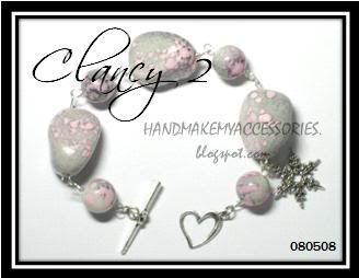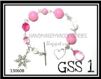 GSS 1 Charm Bracelet! (SOLD!)Consists of faceted hues of pink beads, pink beads, teardrop, heart toggles and a snowflake charm!