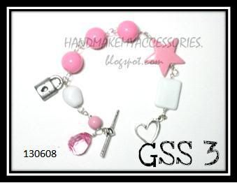 GSS 3 Charm Bracelet! (SOLD!)Consists of pink and white beads, teardrop, heart toggles and an imported padlock charm!