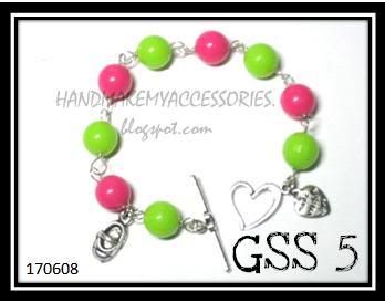 GSS 5 Charm Bracelet! (SOLD!)Consists of pink and bright green beads, heart toggles and a cute shoe charm!