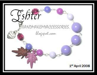 Purple toned beads, with purple hues, a handbag charm, made with love charm, and a leaf charm! (:
