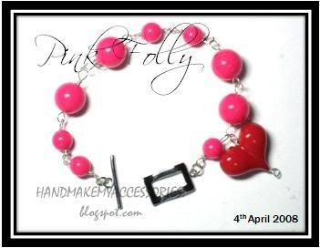 This piece is made up of pink beads, silver tarnish resistant wires, red puffy heart and a silver rhodium clasps!
