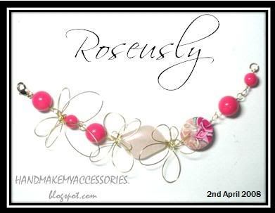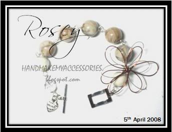 Rosey consists of, silver tarnish resistant wires, rhodium toggles, jumprings, my wired flowers, matched it with silver and brown wires, brown and white beads, clear faceted beads and a made with love charm