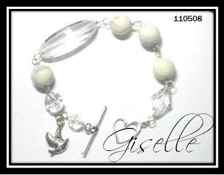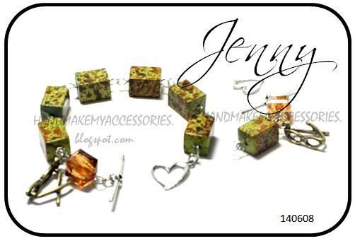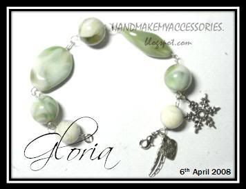 Gloria consists of, silver tarnish resistant wires, rhodium clasps, jumprings, jade-like coloured beads with a tinge of brown (very very gorgeous!), a made with love charm and a feather, a snowflake charm!