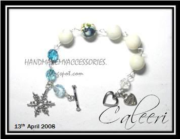 Caleeri consists of, silver tarnish resistant wires, rhodium toggles, jumprings, gorgeous cream coloured beads, faceted hues of blue beads, a made with love charm and a snowflake charm!
