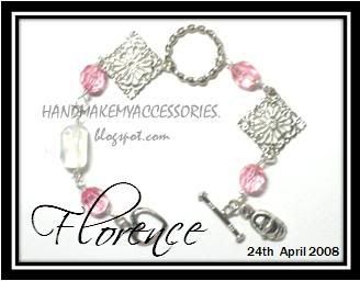 Florence consists of, silver tarnish resistant wires, rhodium toggles, jumprings, gorgeous pink faceted beads, silver filigrees, and a silver circle link with a cute baby shoe charm!