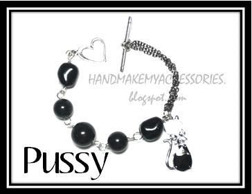 Consists of Black beads, rhodium chains, silver tarnish resistant wires, rhodium toggles, and a super duper cute pussy charm!